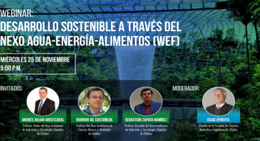 El próximo 25 de noviembre, desde las 5:00 p.m., a través de Google Meet (previa inscripción), se llevará a cabo este webinar organizado desde la Facultad de Ciencias Naturales e Ingeniería, el cual versará sobre la estrategia de gestión integral del agua, la energía y los alimentos como solución para mejorar la calidad de vida de la población y lograr la sostenibilidad de los recursos naturales.