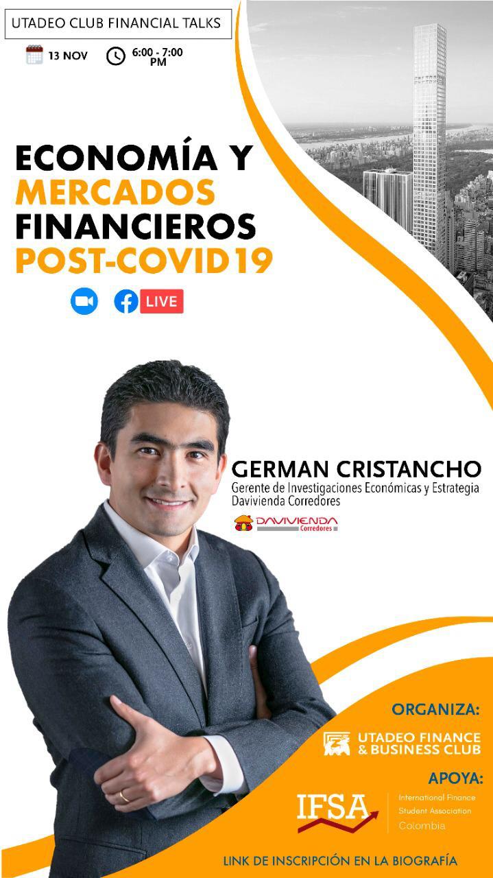 En esta segunda parada de esta serie de charlas, el Club de Finanzas de Utadeo (Utadeo Finance & Business Club) presenta como invitado especial a uno de los referentes del sector financiero en Colombia: German Cristancho, gerente de Investigaciones Económicas y Estrategia Davivienda, en una charla virtual centrada específicamente en el tema “Economía y mercados financieros post-covid19”. El evento será transmitido a través de la página oficial del Club de Finanzas de Utadeo, este jueves 13 de noviembre a la 6:00 p.m.