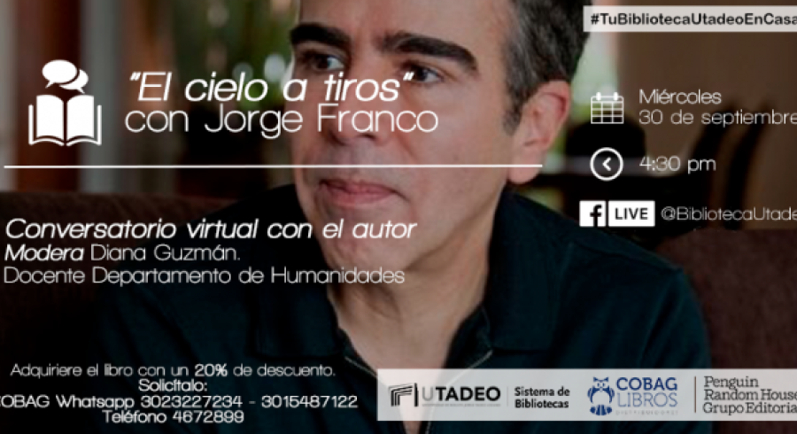 La Biblioteca Utadeo presenta al escritor Jorge Franco, en un conversatorio junto a la profesora Diana Guzmán, el 30 de septiembre a las 4:30 p.m., a través de Facebook Live.