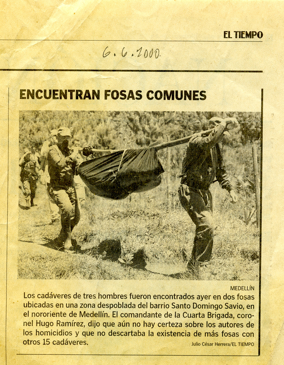 El 6 de julio del 2000, cuando el nuevo milenio apenas empezaba, en una esquina de las páginas del periódico El Tiempo, una foto a blanco y negro de un grupo de militares cargando un cuerpo de manera rudimentaria bajo el título "Encuentran fosas comunes" y un pequeño texto que le daba contexto, estaba siendo observada por la maestra Beatriz González.