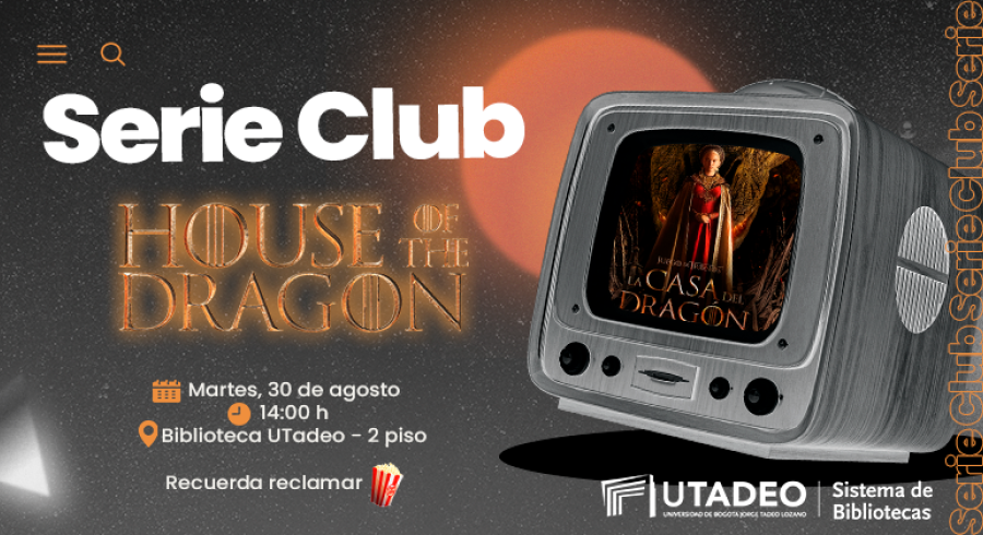 PelículaSerie Club: La Casa del DragónFecha del evento: Martes, Agosto 30, 2022 - 14:00Fecha fin del evento: Martes, Agosto 30, 2022 - 16:00 Compartir en Serie ClubTe invitamos a disfrutar la serie “La Casa del Dragón" Fecha: Martes, 30 de agostoHora: 2:00 p.m.Lugar: Biblioteca UTadeo, Segundo Piso.Entrada libreSinopsis: La historia de la familia Targaryen, 300 años antes de los eventos que tuvieron lugar en "Game of Thrones".Trailer: