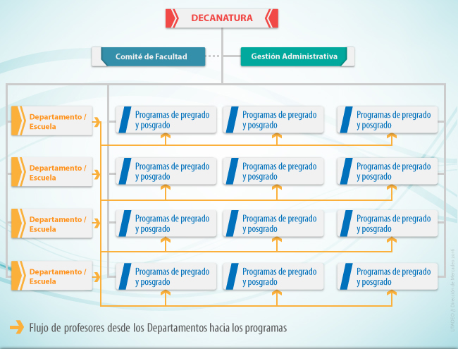 En el Caso de la Universidad, los profesores estarán agrupados por Departamentos según las diferentes disciplinas y prestarán sus servicios en los Programas Académicos, que están organizados por los núcleos de conocimiento; esto permitirá definir lineas de trabajo transversales, formar y consolidar equipos interdisciplinarios y fomentar el liderazgo por especialidades.