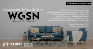#BiblioDato #BiblioCapacitación El Sistema de Bibliotecas de la Universidad Jorge Tadeo Lozano invita a estudiantes y profesores de la Institución a participar en la capacitación del recurso WGSN Lifestyle & Interiors.