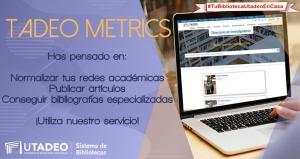 La Biblioteca Utadeo cuenta de manera permanente con Tadeo Metrics, un servicio de asesoría bibliométrica para la investigación y la publicación en la comunidad tadeísta, apoya los procesos de publicación y visibilidad de los investigadores.