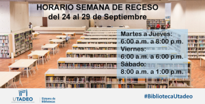Del 18 al 21 de septiembre se llevará a cabo nuestra feria del libro tadeísta, espacio donde se pueden conocer todos los recursos de información disponibles para la investigación con los que cuenta la biblioteca Utadeo, enterarnos de las novedades editoriales de los diferentes fondos y de esta manera realizar una selección de material bibliográfico como apoyo al proceso académico.