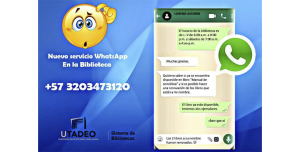 El sistema de bibliotecas Utadeo ofrece el nuevo servicio, WhatsApp como una herramienta más de comunicación en tiempo real, esto con el fin de resolver dudas o consultas relacionadas con los recursos, instalaciones, actividades, horarios, renovaciones o cualquier consulta referida a los servicios de la Biblioteca.