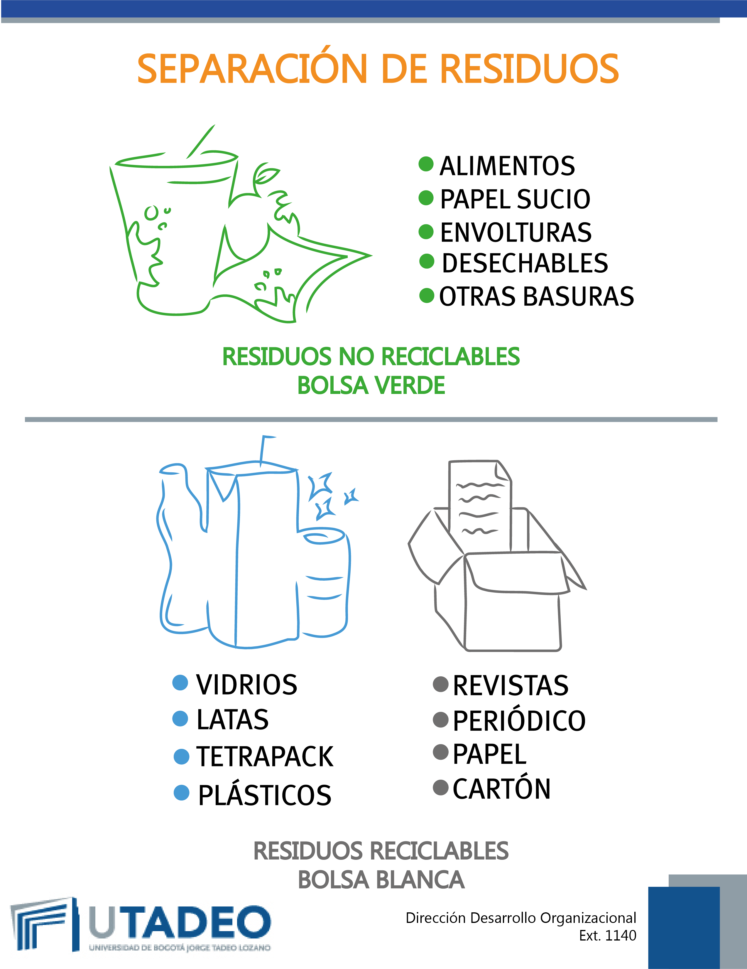Dentro de las acciones de este programa, se encuentra sensibilizar a toda la comunidad Tadeísta para que se realice una adecuada separación en la fuente de los residuos sólidos, para esto se ha definido un código de colores que si se sigue de forma adecuada reduce la contaminación cruzada de los residuos y permite recuperar mayor cantidad de material potencialmente reciclable.