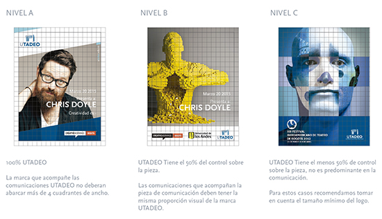 • El resto de las marcas no pueden ser visualmente mayores al logo de UTADEO y su posición será del lado superior izquierdo y podrá subir y bajar dentro de los cuadrantes establecidos para su ubicación.