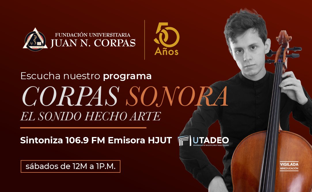 Los invitamos a escuchar el nuevo programa de la EMISORA HJUT 106.9 FM, los sábados de 12 a 1 de la tarde con repetición los lunes a las 10 de la noche. Con la presentación del compositor y director Arturo Parra y la producción de la Fundación Universitaria Juan N. Corpas. Corpasonora el sonido hecho arte, un recorrido vital por el ejercicio artístico en la Universidad Juan N. Corpas y su Escuela de Música.