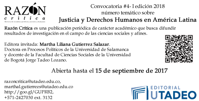 Razón Crítica, revista de estudios jurídicos, sociales y humanos, adscrita a la Facultad de Ciencias Sociales de Utadeo, invita a la comunidad académica a enviar artículos sobre justicia y derechos humanos en América Latina, para el número temático I-2018.