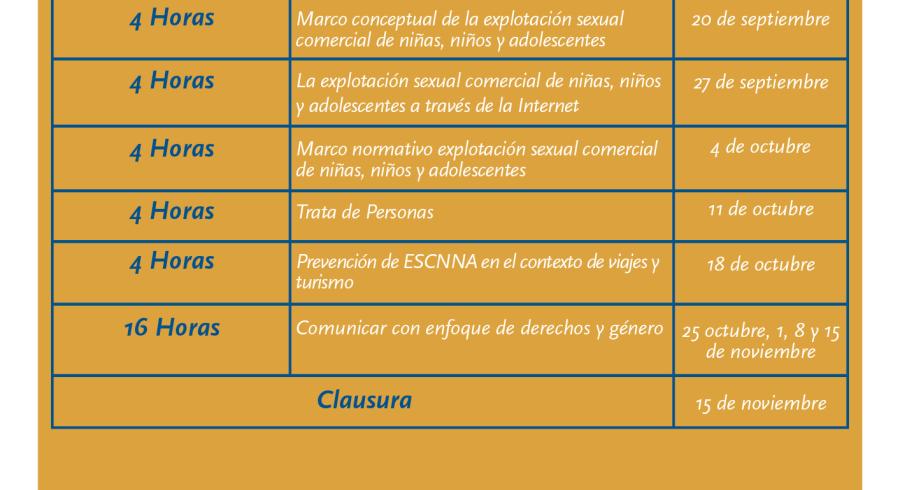 Los participantes tendrán la oportunidad de conocer sobre periodismo digital, perspectiva de género, explotación sexual comercial de niñas, niños y adolescente, trata de personas y comunicar con enfoque de derechos y género entre otros. Se contará con la participación de ponentes nacionales e internacionales.