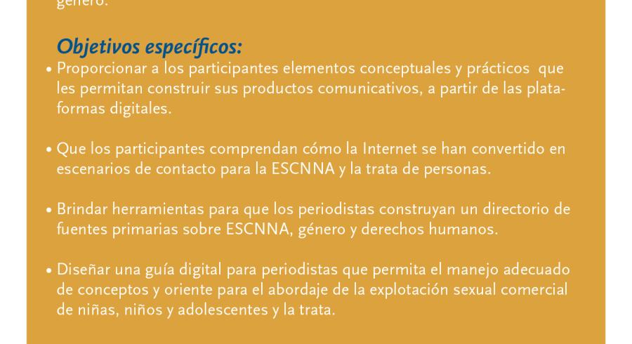Con el objetivo de brindar herramientas técnicas y conceptuales a los periodistas sobre la prevención de la explotación sexual comercial de niñas, niños y adolescentes y la trata de personas para que informen con enfoque de derechos y género, las universidades Jorge Tadeo Lozano, Los Libertadores, la Alcaldía de Cartagena y la Fundación Renacer, han diseñado este diplomado para las ciudades de Bogotá y Cartagena.