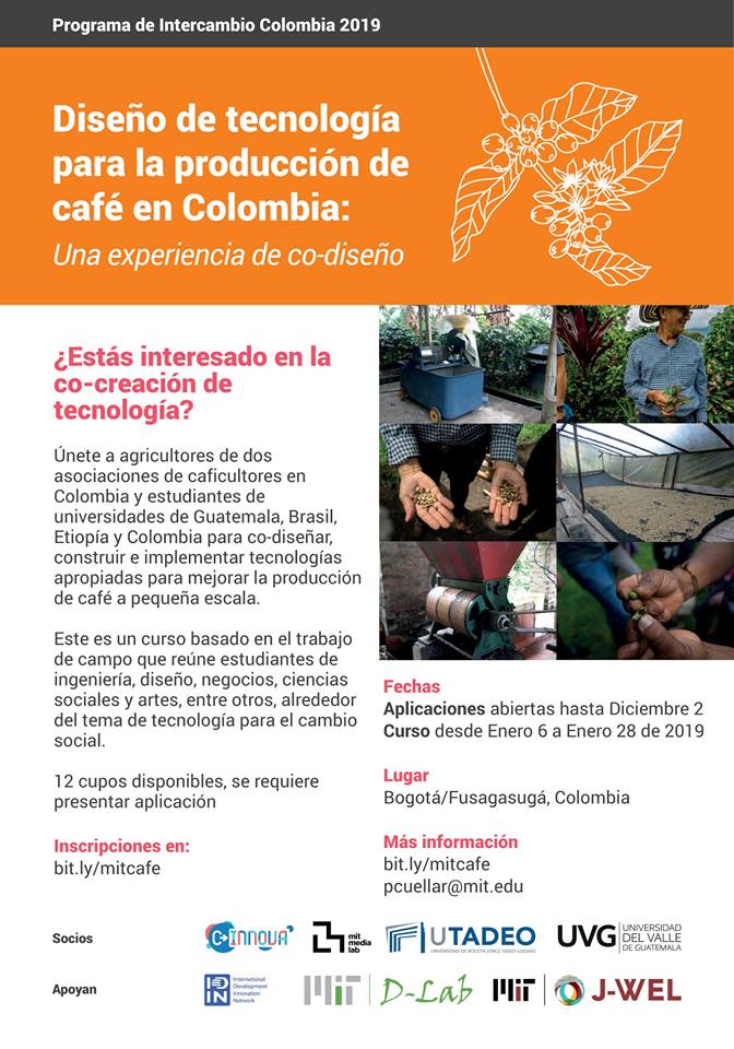 En este curso de campo, pequeños caficultores y estudiantes del Massachusetts Institute of Technology– MIT y otras universidades provenientes de países productores de café, co-diseñarán tecnologías, modelos de negocio e intervenciones artísticas/sociales para apoyar el mejoramiento del proceso productivo del café.
