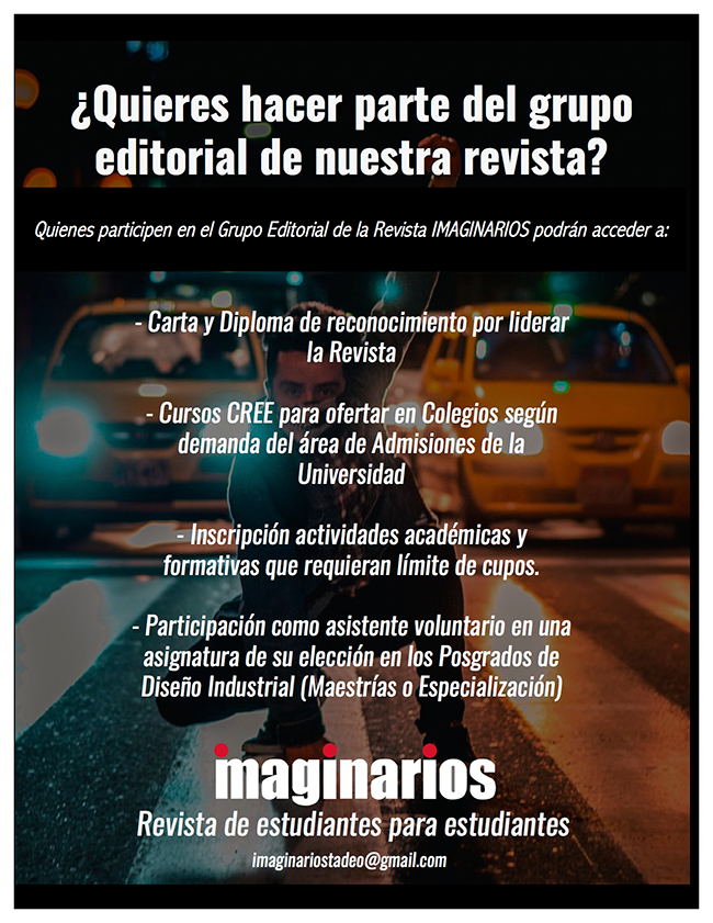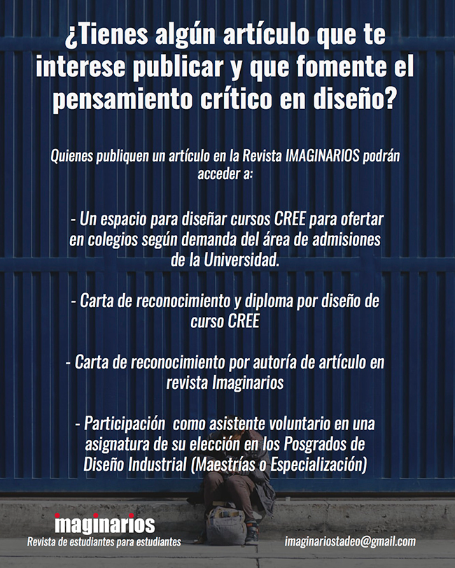 Imaginarios se plantea como una revista de diseño de estudiantes para estudiantes, que busca incentivar el pensamiento crítico, el análisis y la argumentación en esta disciplina. Conozca aquí cómo hacer parte de la Revista. La convocatoria cierra el 12 de mayo.