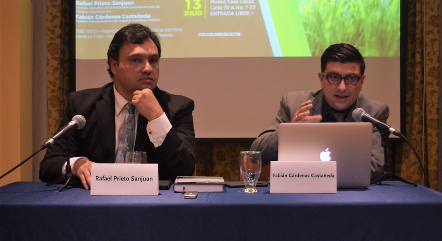 Motivados por la ocasión Rafael Prieto profesor de la Pontificia Universidad Javeriana y Fabián Cárdenas profesor de la UTadeo, ambos reconocidos expertos en temas jurídicos internacionales presentaron apartes de sus investigaciones sobre responsabilidad internacional en su más reciente publicación titulada “La Responsabilidad Internacional del Estado y el Medio Ambiente: un debate urgente”, la cual fue gestada desde el Grupo ad hoc de Responsabilidad Internacional y Medio Ambiente de la Sociedad Latinoamericana de Derecho Internacional, coeditado por sus directores, el Profesor Prieto y el Profesor argentino Alberto Cesar Moreira.