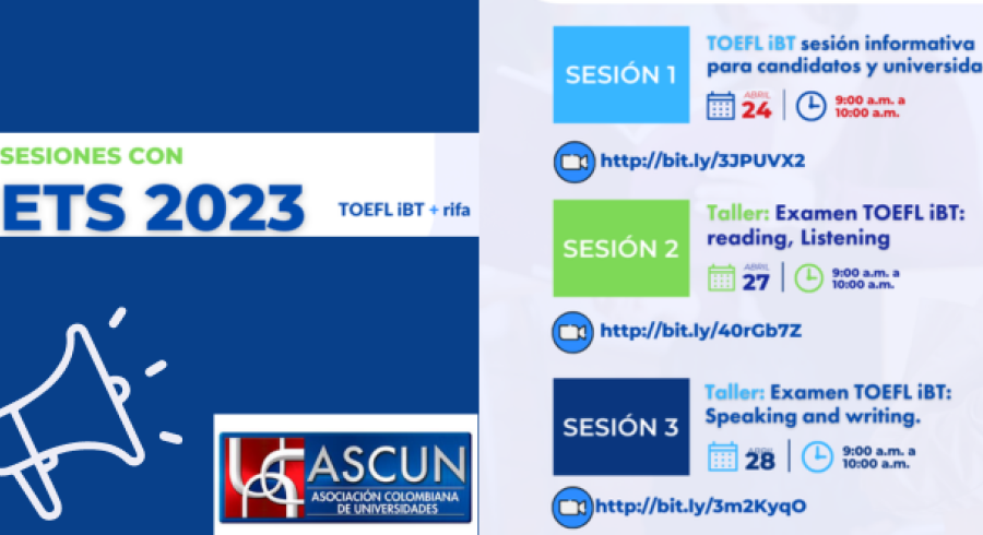 La Asociación Colombiana de Universidades – ASCUN y Educational Testing Service (ETS) tenemos el gusto de invitarlos a participar en tres nuevas sesiones virtuales y una sorpresa especial, dirigidas a nuestras IES asociadas (Departamentos de lenguas, estudiantes y candidatos que vayan a tomar el examen TOEFL IBT), que se realizarán el 24, 27 y 28 de abril de 2023, de 9:00 a.m. a 10:00 a.m. y son organizadas en el marco del convenio entre ASCUN y ETS.