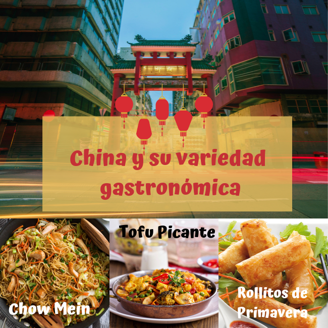 Pero china al tener grandes estructuras y sitios espectaculares, su variedad de platos típicos no se quedan atrás, el famoso Chow Mein es un plato con una rica fuente de nutrición este plato contiene fideo,carne, cebolla y apio, el tofu picante, es uno de los platos mas populares de la cocina de Sichuan, que es queso de soja y carne de vacuno y se acompaña con arroz japonés y no podía faltar los deliciosos rollitos de primavera que son un aperitivo y se come generalmente durante la Fiesta de Primavera en China, y se asemeja a las barras de oro y la gente las relaciona con las ideas de la riqueza.