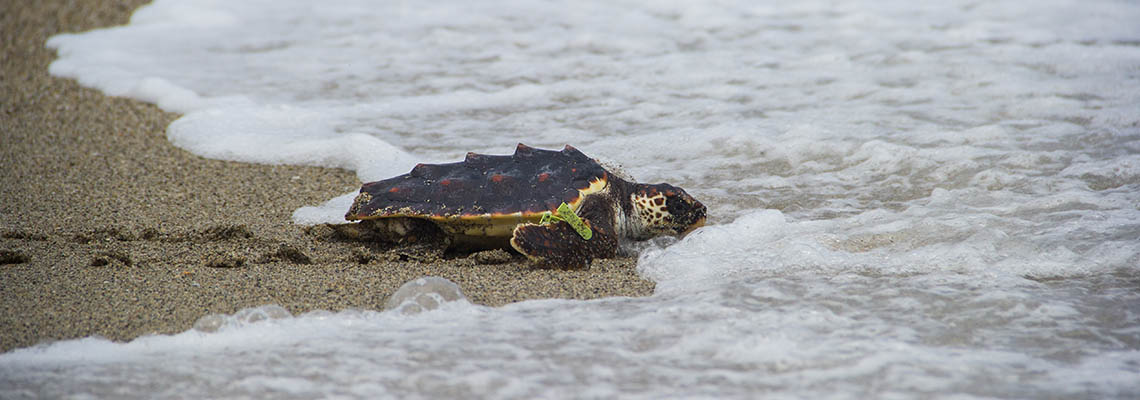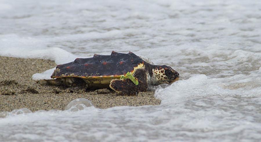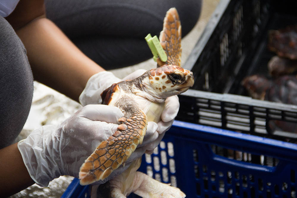 Ejemplar juvenil de tortuga Caguama, luego de marcado.