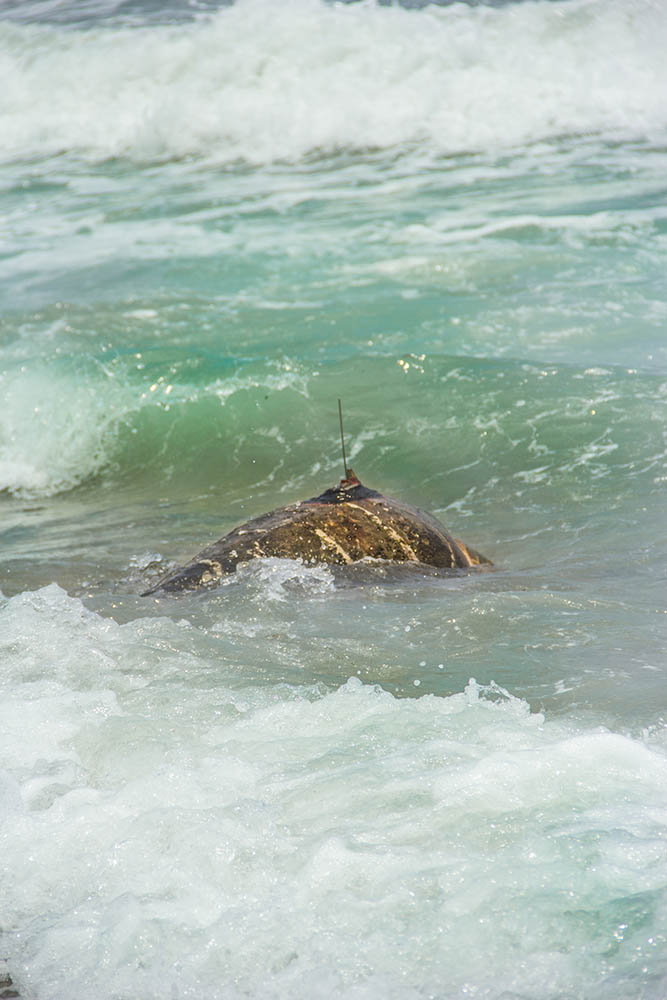 Luego de ello, se aplica una capa de melaza, que funciona como pegamento natural del transmisor, y se procede a instalar la antena fabricada por la compañía francesa Argos, que tiene un peso cercano a los 150 gramos y cuesta cerca de 1.700 dólares. El dispositivo enviará la ubicación de la tortuga cada vez que esta salga a la superficie del mar, y así mismo, sus registros podrán visualizarse en tiempo real a través del portal web de Seaturtle.