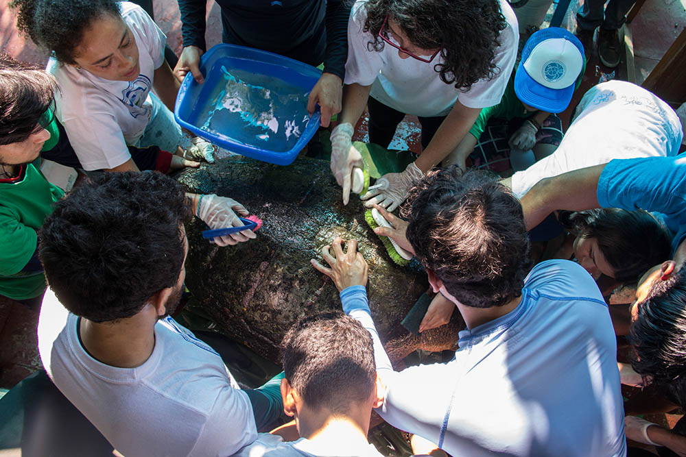 Tras 50 minutos de espera, los voluntarios aplican a Mateo una capa de antiadherente, una especie de pintura transparente que evita que nuevamente se adhieran a su cuerpo algas, flora y fauna del hábitat.