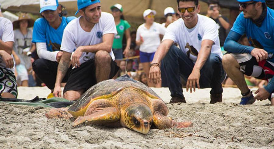El turno era ahora para los juveniles. Aquellos que hace menos de un año, cuando aún eran recién nacidos, fueron rescatados de estas mismas playas, con el fin de preservar sus vidas de los depredadores naturales y del hombre, quien en estas latitudes consume sus huevos y su carne, al tiempo que utiliza su caparazón y aceite. Los primeros en liberarlas fueron Andrés Franco, director del Departamento de Ciencias Biológicas y Ambientales de Utadeo, y el presidente de Petrobras International Braspetro B.V. Sucursal Colombia, Rodrigo Valle Real.