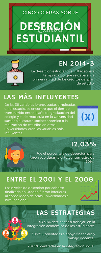 La profesora Sandra Patricia Barragán, del Grupo de Investigación Fundamentos y Didáctica de las Ciencias del Departamento de Ciencias Básicas y Modelado, ha indagado, desde 2009, las causas de la deserción, así como el impacto que tienen las estrategias de retención de estudiantes en universidades como Utadeo, haciendo uso del modelado matemático y estadístico: “Al tener contacto con las personas y observar que muchas de ellas vienen a la Universidad y luego no regresan, para uno como profesor es una situación triste”, comenta la docente acerca de los factores que la llevaron a sentir interés por el tema.