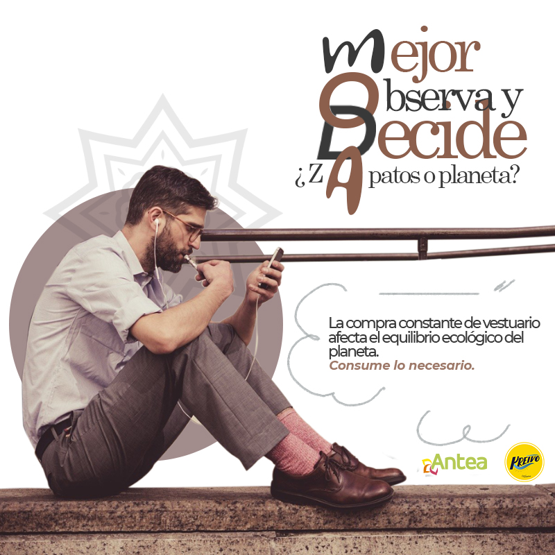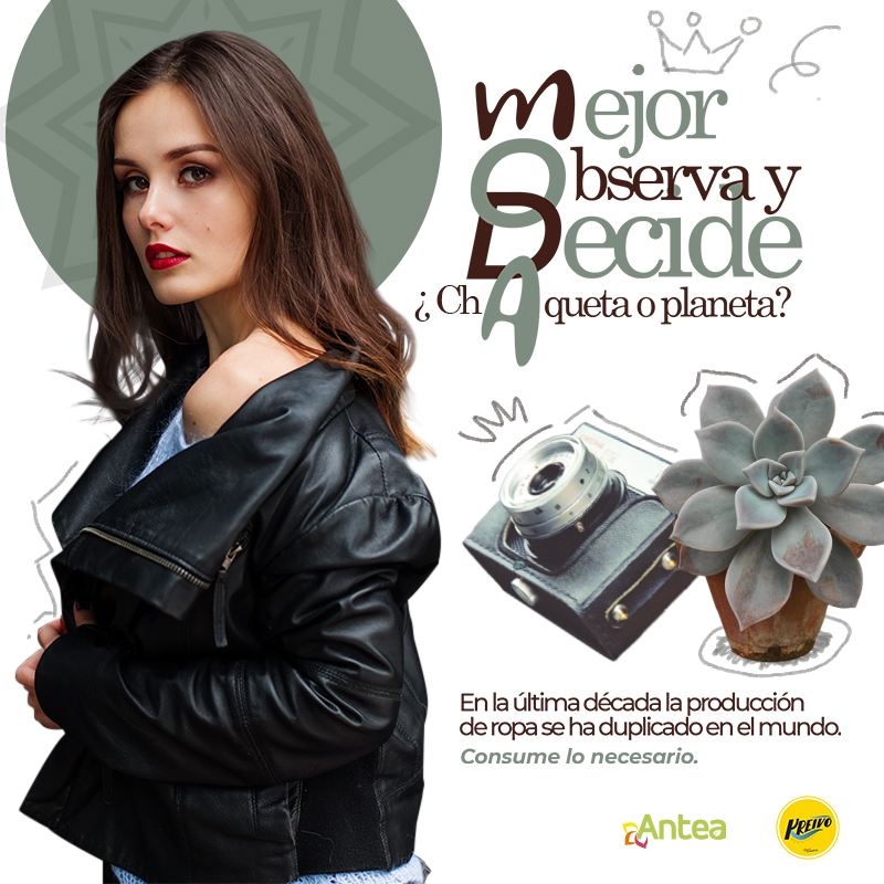La primera de ellas se basó en el concepto “Mejor observa y decide”; esta se desarrolló a través de redes sociales y buscaba que los públicos reflexionaran sobre las opciones de preferir estar a la moda o estar del lado del planeta. Para ello se emplearon datos estadísticos científicamente comprobados en torno al impacto que la industria ha dejado, pero también lo que los hábitos alrededor de la moda le generan al planeta, como el hecho de que, en el proceso de lavado, algunas microfibras se desprendan de las prendas y puedan afectar fuentes hídricas y ambientales. En esta primera fase, también se invitó a que los jóvenes se unieran a la iniciativa, a través de videos en los que enviaban mensajes sobre cómo interpretaban el consumo sostenible.