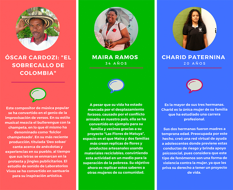 Estas historias de vida, al igual que las de otros 600 habitantes de estos municipios, han sido transformadas a partir del arte, la comunicación y la cultura desde el año 2015, a través del proyecto de investigación en ciencia y tecnología: Laboratorios Vivos de Innovación y Cultura, que se ejecuta con los recursos del Sistema General de Regalías. El objetivo principal es la implementación de una estrategia para el uso y apropiación de la cultura como generadora de conocimiento e innovación social, donde se fomenta la investigación y se empodera a los pobladores en el uso de tecnologías, como las cámaras fotográficas y de vídeo, los micrófonos, computadores y equipos de edición que antes consideraban inaccesibles: “El reto principal es poder entregar estos contenidos, conocimientos y saberes desde un lenguaje muy sencillo. Es bajar todo el lenguaje académico a un plano de fácil comprensión para generar diálogos, a partir de dinámicas de co-creación”, comenta César Augusto Prieto, coordinador del Área de Inclusión Productiva de Laboratorios Vivos.