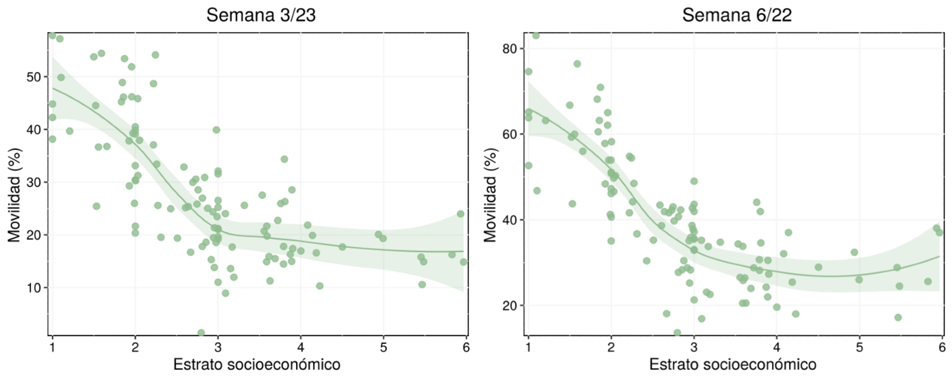 Las gráficas representan los cambios de movilidad en diferentes semanas en función del estrato socioeconómico. Imagen: Cortesía
