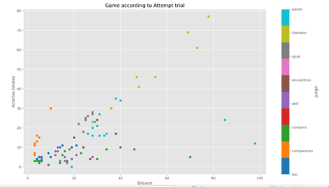 Gráfico de análisis de los datos en las pruebas. Aquí se muestra la cantidad de ensayos realizados en un juego versus los aciertos totales
