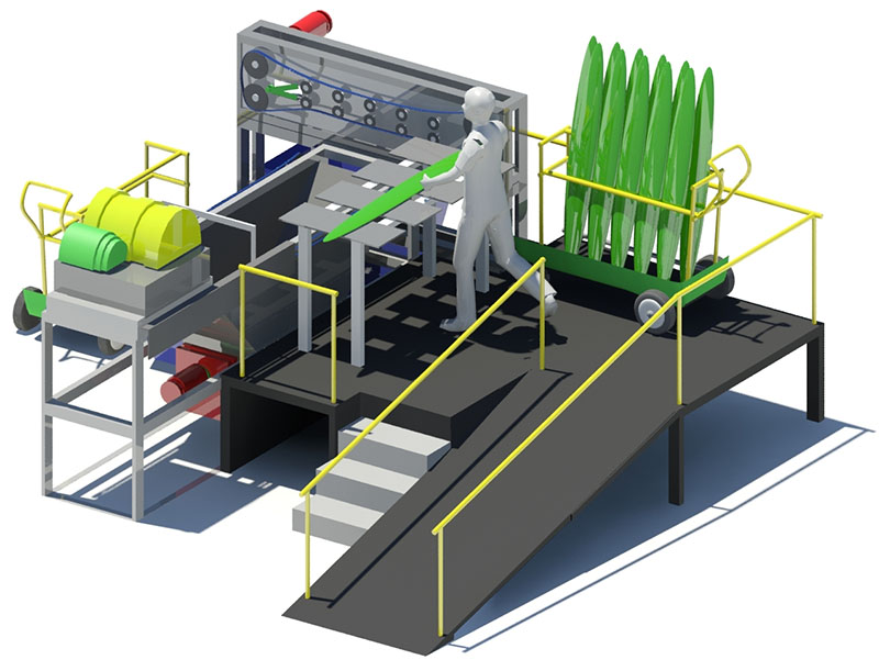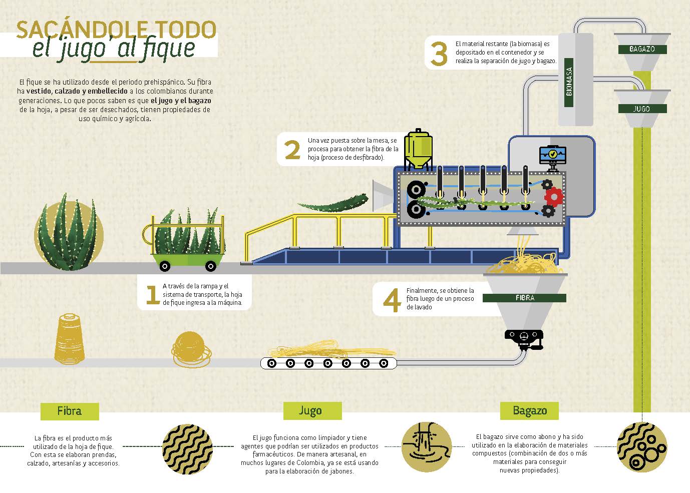 La propuesta desarrollada busca la automatización en la extracción de los tres subproductos del fique, de tal manera que el operario solo tenga que ingresar las hojas, y al finalizar el proceso, recoger la fibra, el jugo y el bagazo por separado. El sistema de desfibrado tradicional se hace con motores diésel, pero el de la patente es completamente eléctrico, lo cual garantiza la eficiencia ambiental.