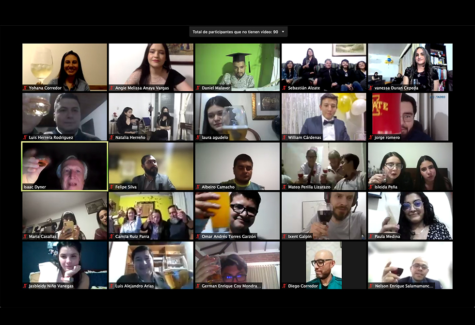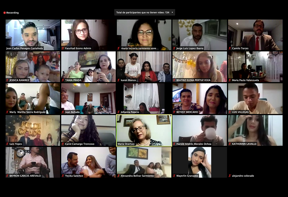 Luego de finalizar las ceremonias de grado, cada uno de los graduandos tuvo la oportunidad de reunirse con los compañeros y profesores que marcaron su camino en la Universidad; esta fue la oportunidad perfecta para reencontrarse, charlar y hasta ‘adelantar cuaderno’. Las salas de reunión en Zoom rápidamente se convirtieron en escenario de una fiesta, de brindis por el éxito obtenido, pero también de colores, decoraciones y la cálida compañía de los familiares de nuestros egresados.