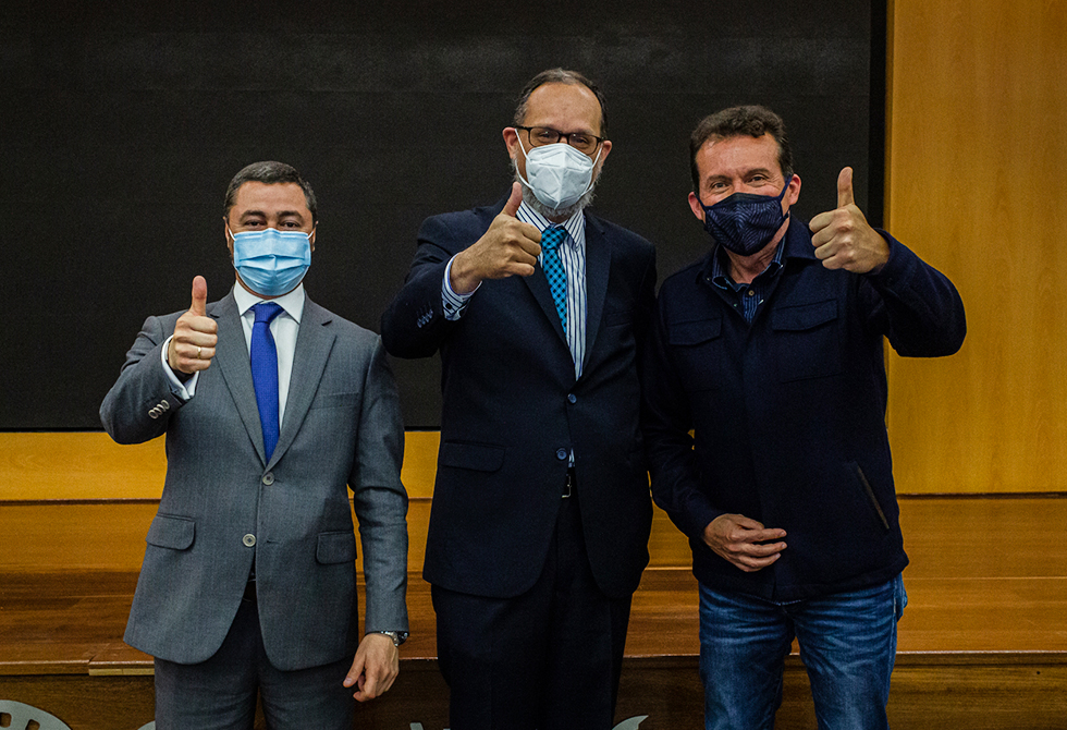De izquierda a derecha: Julián Dicker, jefe de Educación Continua; Andrés Franco, vicerrector Académico, y Edgar Vargas, director de la Maestría en Gestión Sostenible del Agua de Utadeo