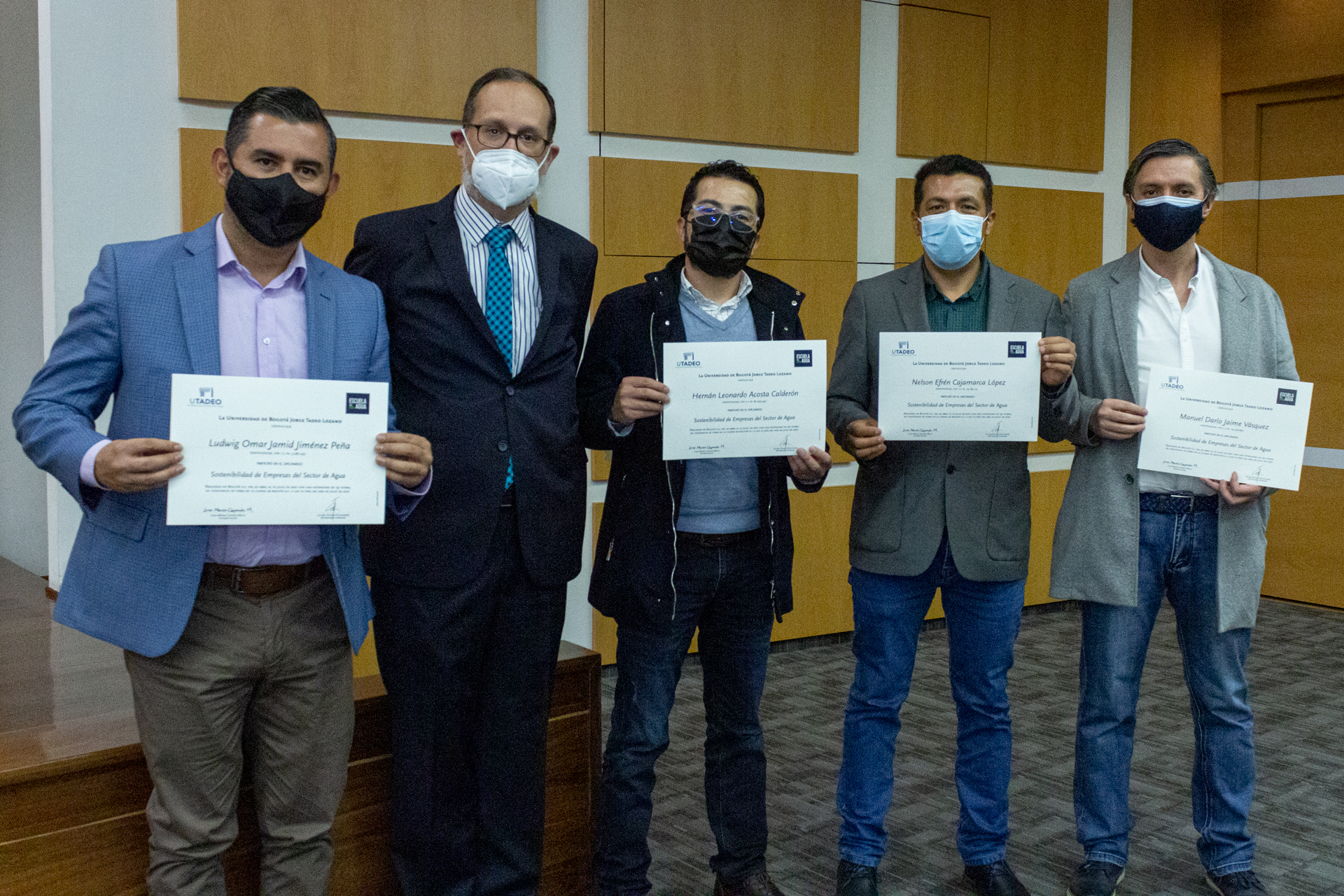 Con la presencia del Vicerrector Académico de nuestra Universidad, Andrés Franco, y de Edgar Vargas, director de la Maestría en Gestión Sostenible del Agua de Utadeo, se llevó a cabo la ceremonia de graduación de los 15 estudiantes del Diplomado en Sostenibilidad de Empresas del Sector Agua, efectuado por Utadeo y la Escuela del Agua de Barcelona, en el que participaron colaboradores de Empresas Públicas de Cundinamarca (EPC), entre ellos algunos de sus altos funcionarios.