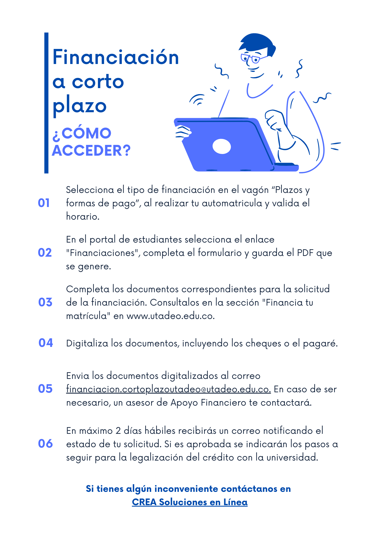 Teniendo en cuenta la coyuntura actual y con el fin de evitar los desplazamientos por la ciudad, los estudiantes tadeístas desde ahora podrán realizar los trámites de Apoyo Financiero virtualmente. En este sentido, la Universidad ha establecido una serie de pasos y canales según el tipo de financiación que el estudiante elija: Corto Plazo, ICETEX, Terceros (Entidades financieras).