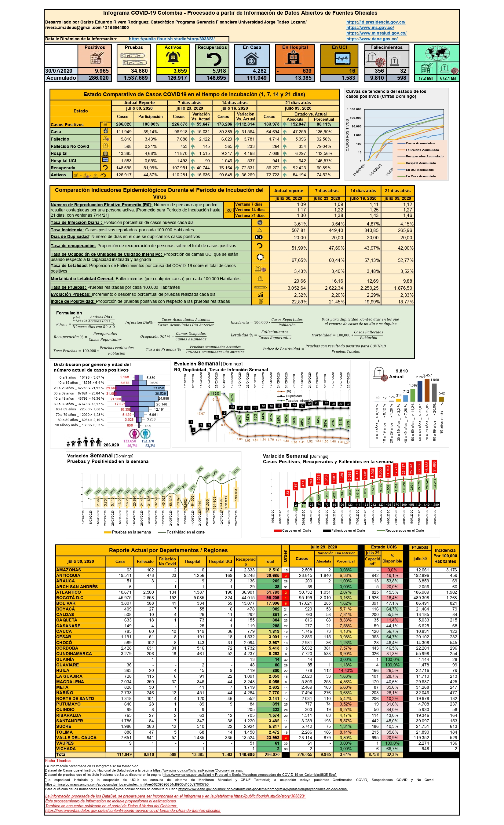 - Con corte al 30 de julio, Colombia ascendió en el listado de países con mayor número de infectados, ocupando el puesto 12 con 286.020 casos [Variación mensual de 176.515 casos]. Somos el quinto país con más nuevos casos en un día [9.965] y más fallecimientos, también en un día [356]. Lamentablemente, se alcanzó la cifra de 9.810 fallecimientos, 6.033 en un mes. Y en la región somos el puesto 4 por debajo de Brasil, Perú y Chile