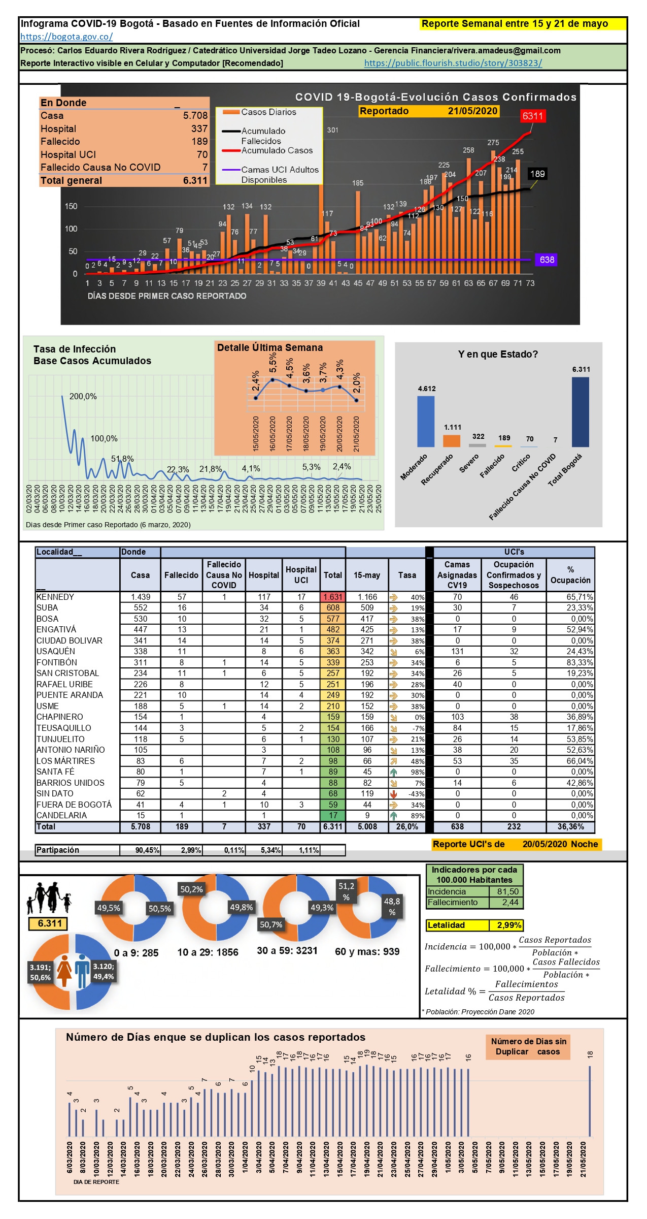 A corte del 21 de mayo, la Alcaldía de Bogotá en su sitio web reporta un acumulado de 6.311 casos, con respecto al 15 de mayo, lo que equivale a 1.303 nuevos casos; esto corresponde a una tasa de incremento semanal del 26%. Del acumulado de casos para Bogotá se destaca: