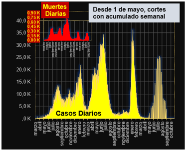 • Casos confirmados: 6’302.809; casos activos: 5.219; pacientes valorados como recuperados: 6’128.460; pacientes que pasaron la enfermedad en casa: 6’153.583; personas fallecidas por causa directa del Covid: 141.646; personas fallecidas por complicación de comorbilidad: 27.484; pruebas PCR aplicadas: 21’293.031, y con respecto a la vacunación se han aplicado al 9 de agosto 87’566.541 dosis.