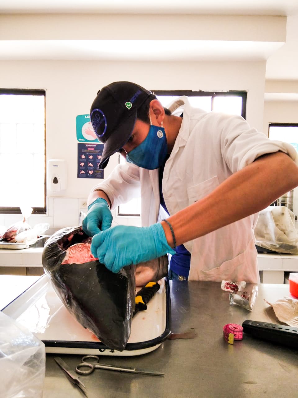 Óscar Iván Forero durante uno se sus análisis de hábitos tróficos de Tiburones en el Golfo de Salamanca.