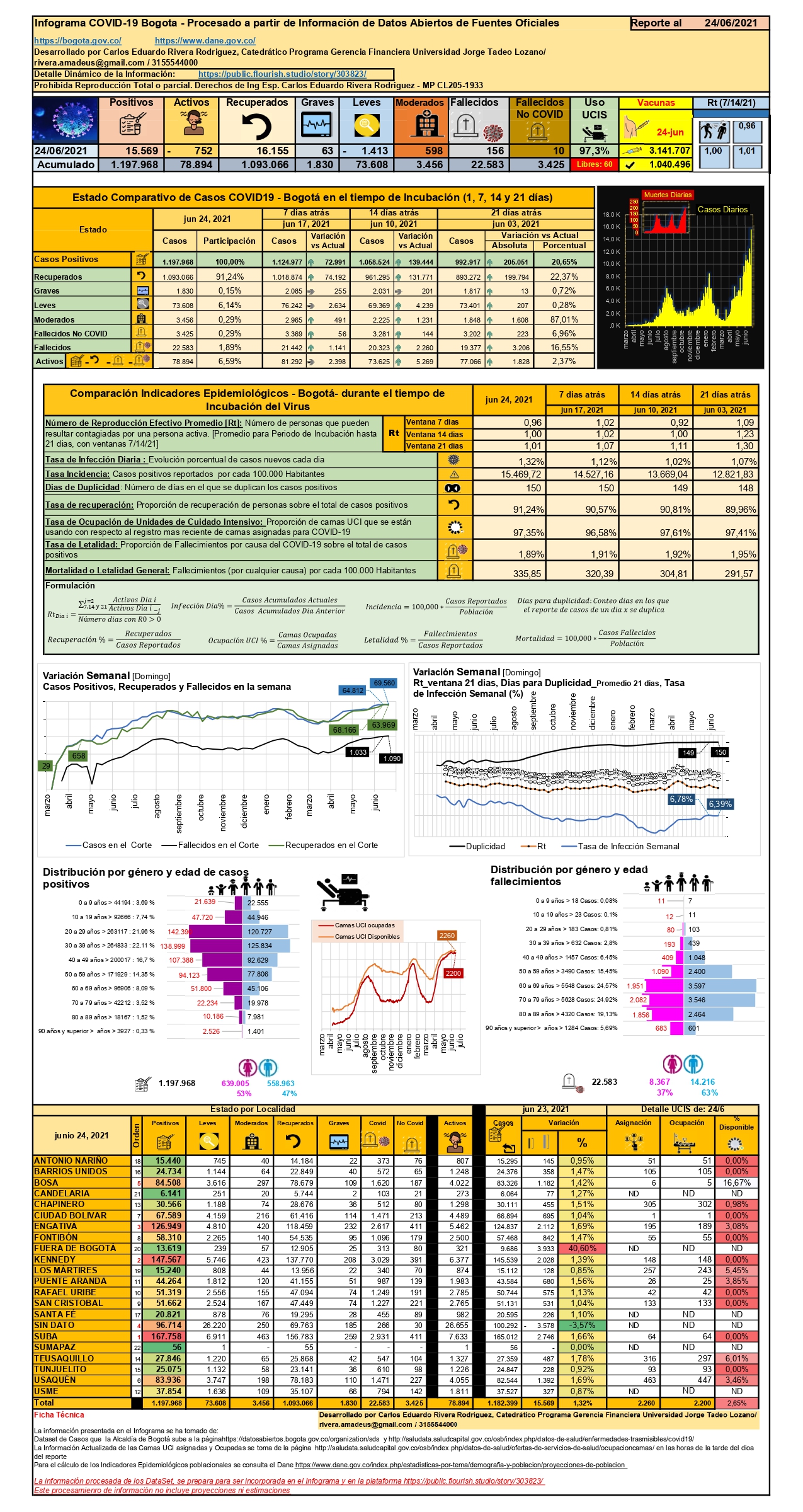 Bogotá, en concordancia con la situación del país, el 24 de junio llegó a su máximo de casos por día durante la pandemia con 15.569 eventos para un acumulado de 1’197.968 casos y con una tasa de letalidad de 1.89%. Se tuvieron para el mismo corte 156 fallecimientos y un acumulado de 22.583 muertes; el 21 de junio se tuvo la cifra máxima de 200 eventos. Al avaluar el comportamiento en la ventana epidemiológica de 21 días, se detectaron desde el 3 de junio 205.051 casos positivos con un índice de velocidad de infección de 1,30 posibles casos a infectar por cada positivo, ocurrieron en este periodo de tiempo 3.206 fallecimientos y se recuperaron 199.794 personas.