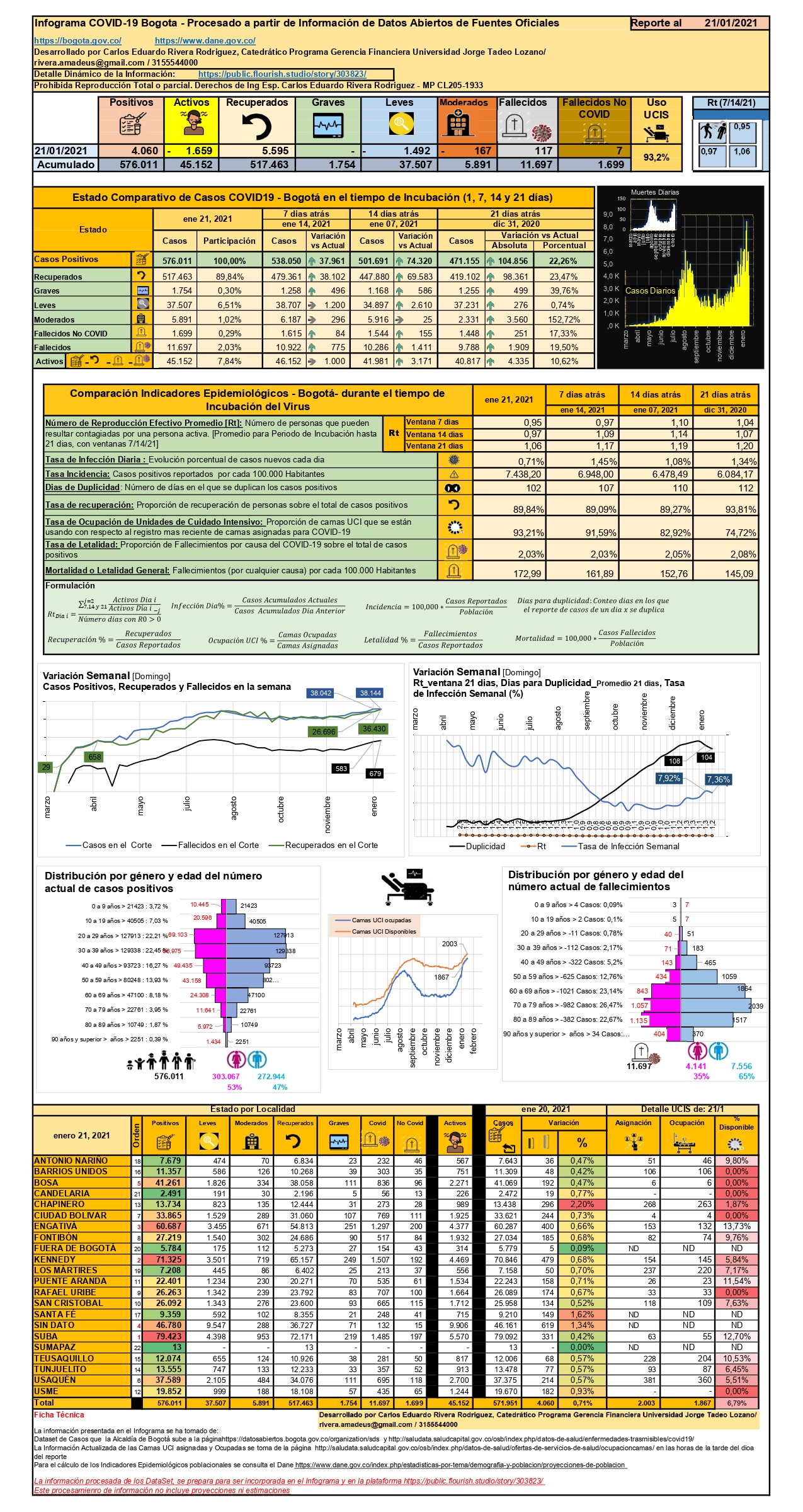• Desde el inicio de la pandemia, Bogotá ocupa el primer lugar en el grado de infección en Colombia, llegando a 576.011 casos (104.856 en lo que va de Enero, equivalente a un 22,26% de incremento). La incidencia (casos positivos por cada 100.000 habitantes) está en 7.438 casos y en constante alza en el ciclo epidemiológico 7, 14 y 21 días: 6.084, 6.478 y 6.948, respectivamente. Con respecto a nuevos casos en un día, se alcanzó la cifra récord desde el inicio de la pandemia el 15 de enero, con 8.845 casos.