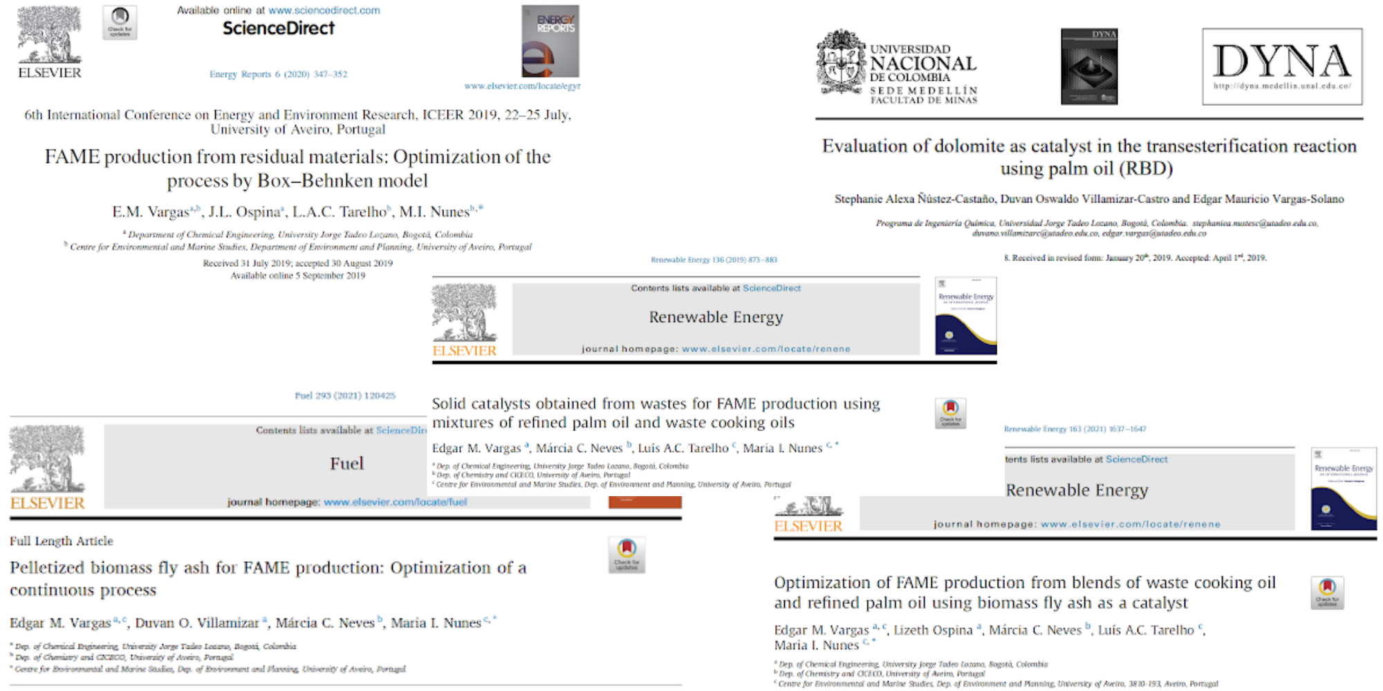 Este trabajo también le ha valido al profesor Vargas la publicación de cinco artículos en Scopus, revistas de muy alto impacto a nivel internacional (Elsevier), titulados: Solid catalysts obtained from wastes for FAME production using mixtures of refined palm oil and waste cooking oils, en el journal “Renewable Energy”, clasificado en Q1; FAME production from residual materials: optimization of the process by box-behnken model, en el journal “Energy Reports”, clasificado en Q1; Optimization of FAME production from blends of waste cooking oil and refined palm oil using biomass fly ash as a catalyst, en el journal “Renewable Energy”, clasificado en Q1; Pelletized biomass fly ash for FAME production: optimization of a continuous process, en el journal “Fuel, clasificado en Q1, y Evaluation of dolomite as catalyst in the transesterification reaction using palm oil (RBD), en el journal “DYNA”, clasificado en Q3.