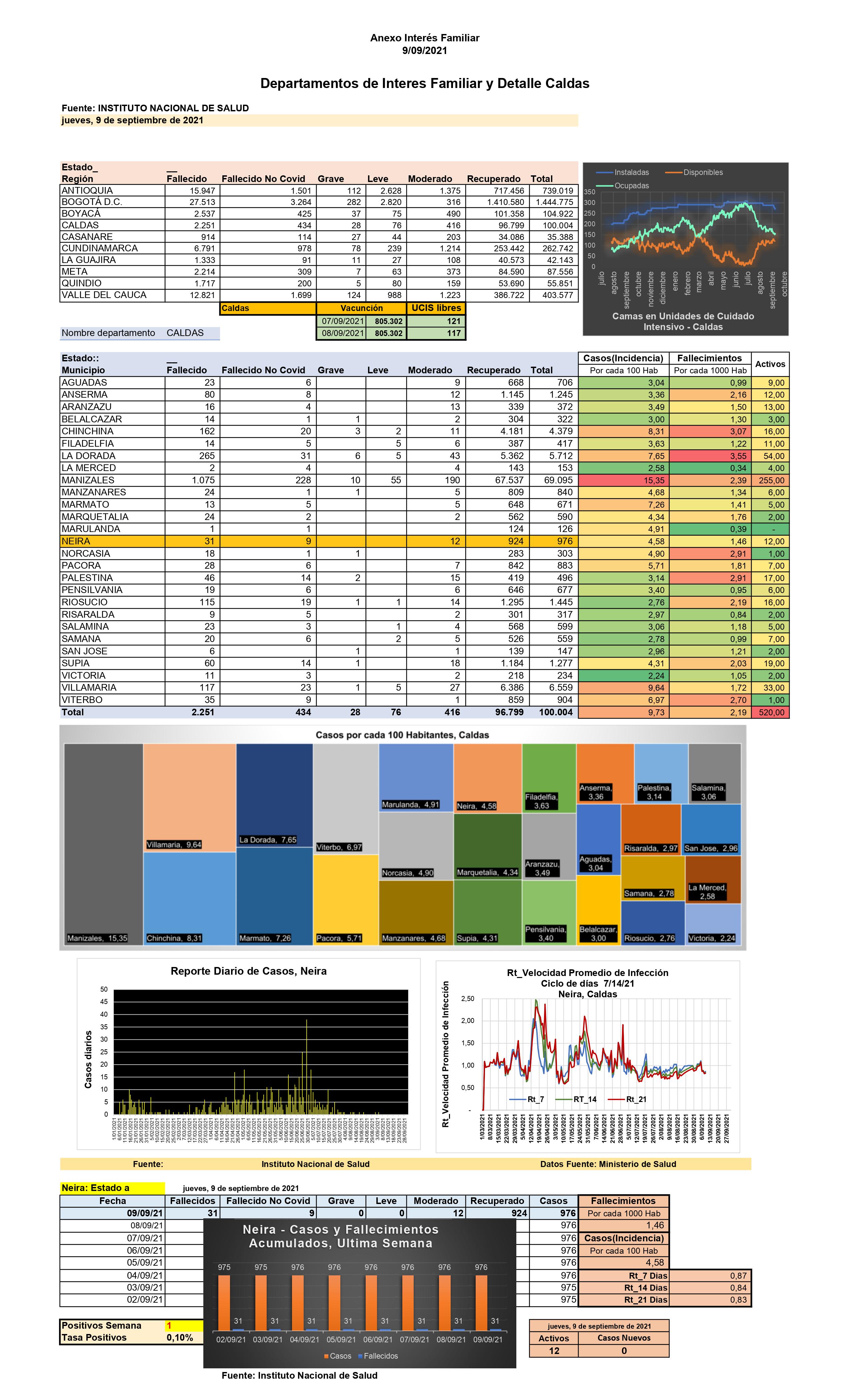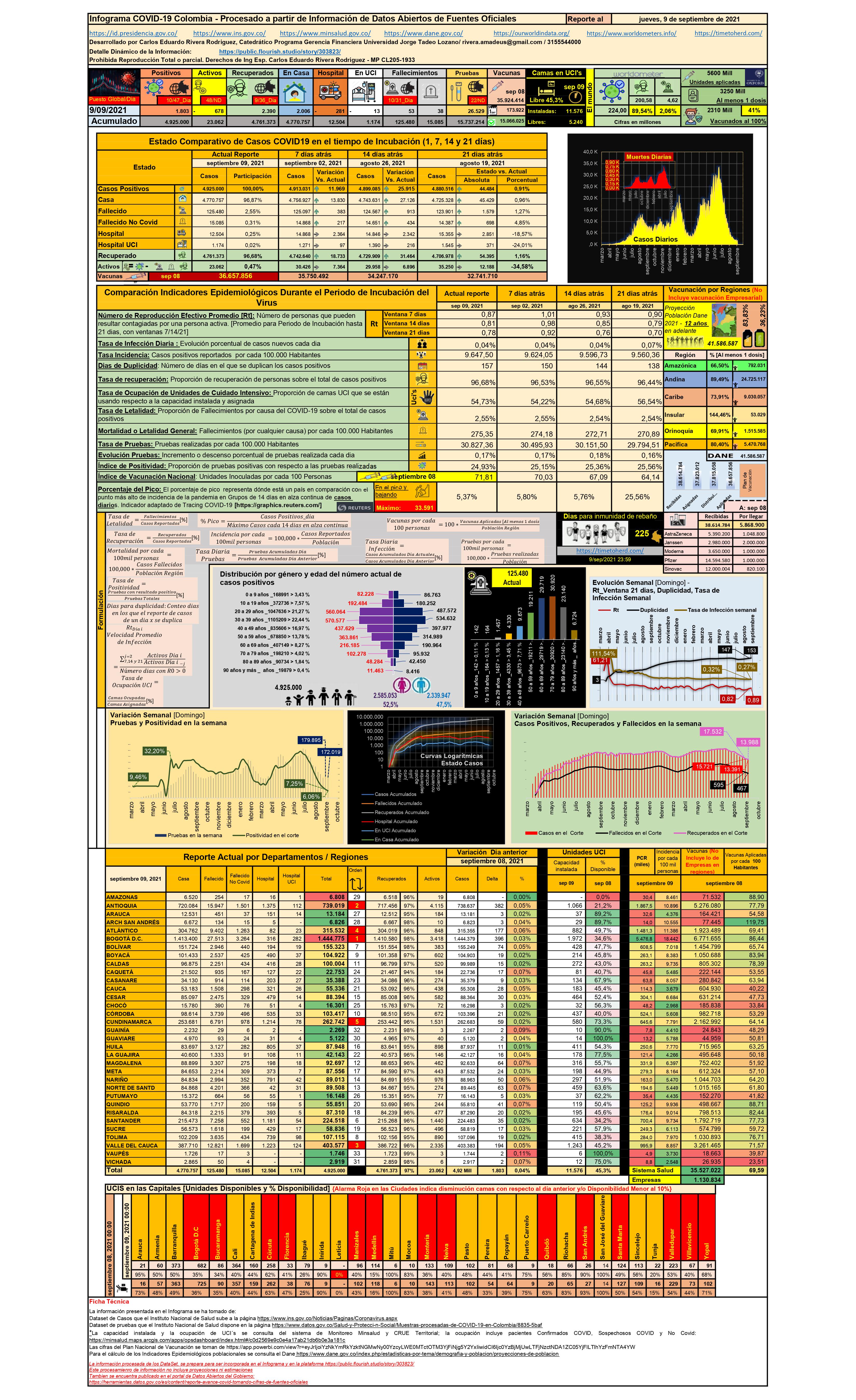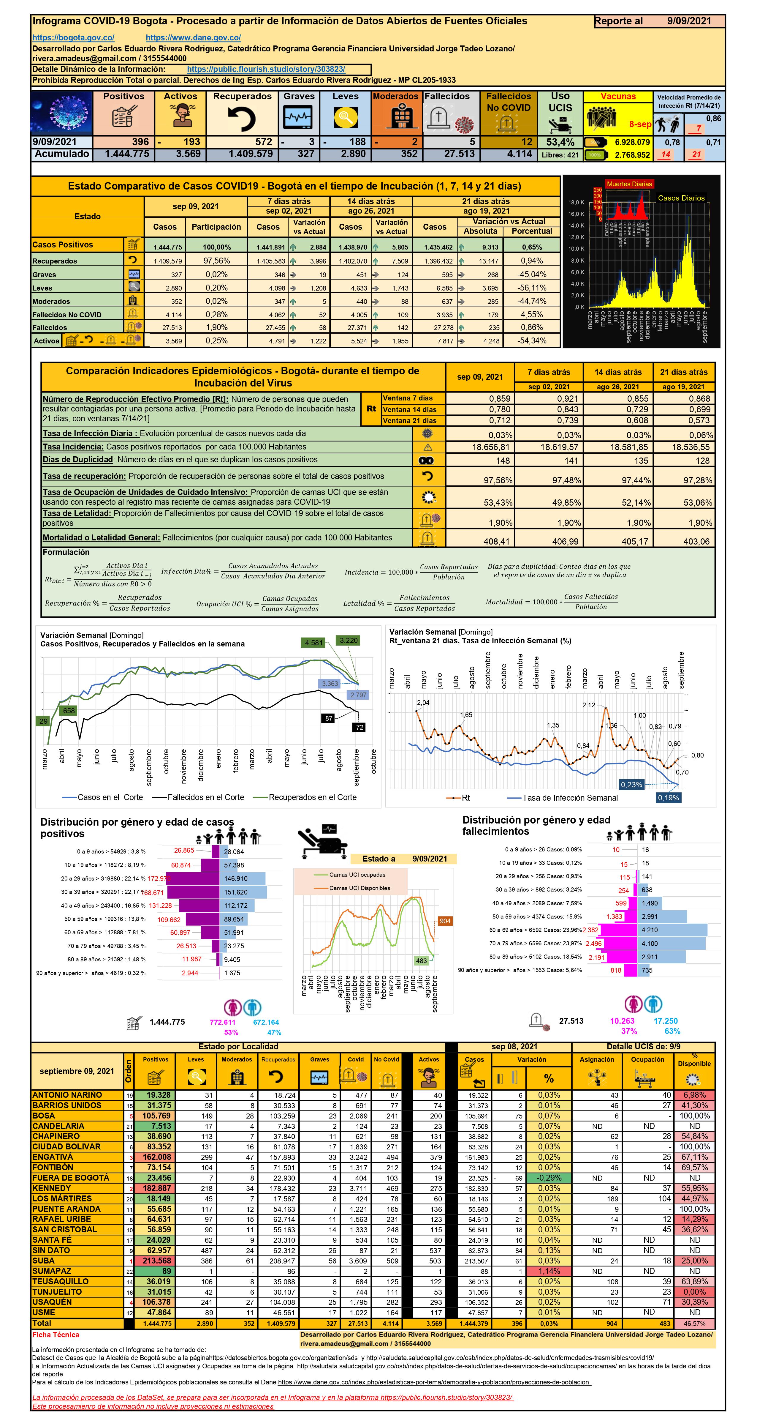 Por su lado Bogotá, con 396 casos positivos para el 9 de Septiembre, llegó a un acumulado de 1’444.775 personas positivas, con 5 fallecimientos para el mismo día tiene un agregado de 27.513 muertes, se han recuperado 1’409.579 personas, en lo que respecta a la vacunación a corte del 8 de septiembre el Observatorio de Salud reporta una aplicación de 6’928.079 dosis, de las cuales 2’768.952 personas ya cuenta con el esquema total de vacunación.