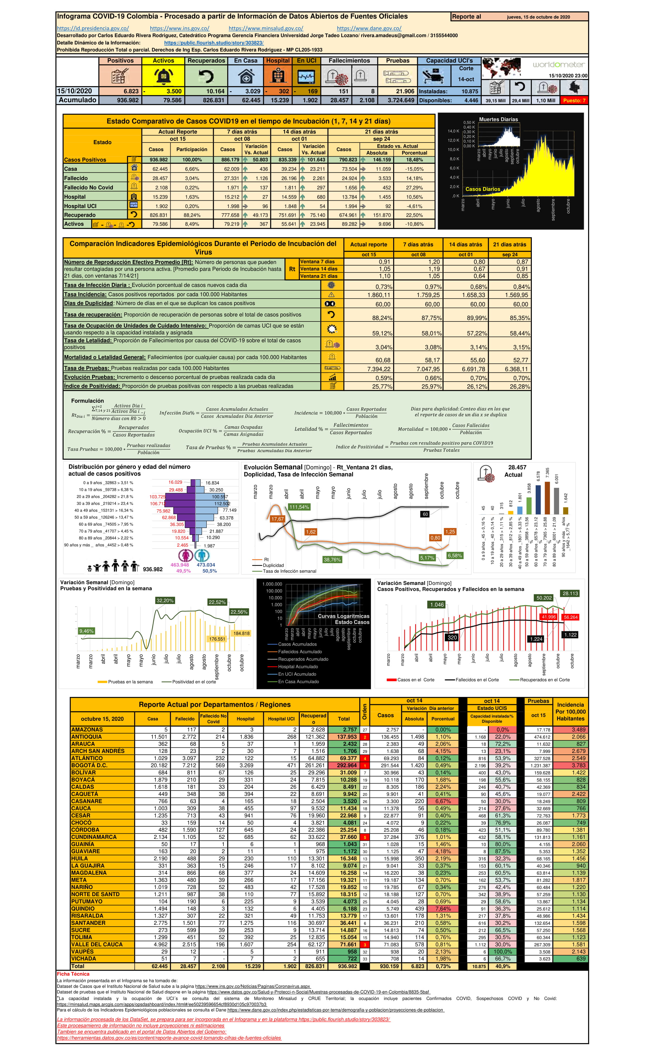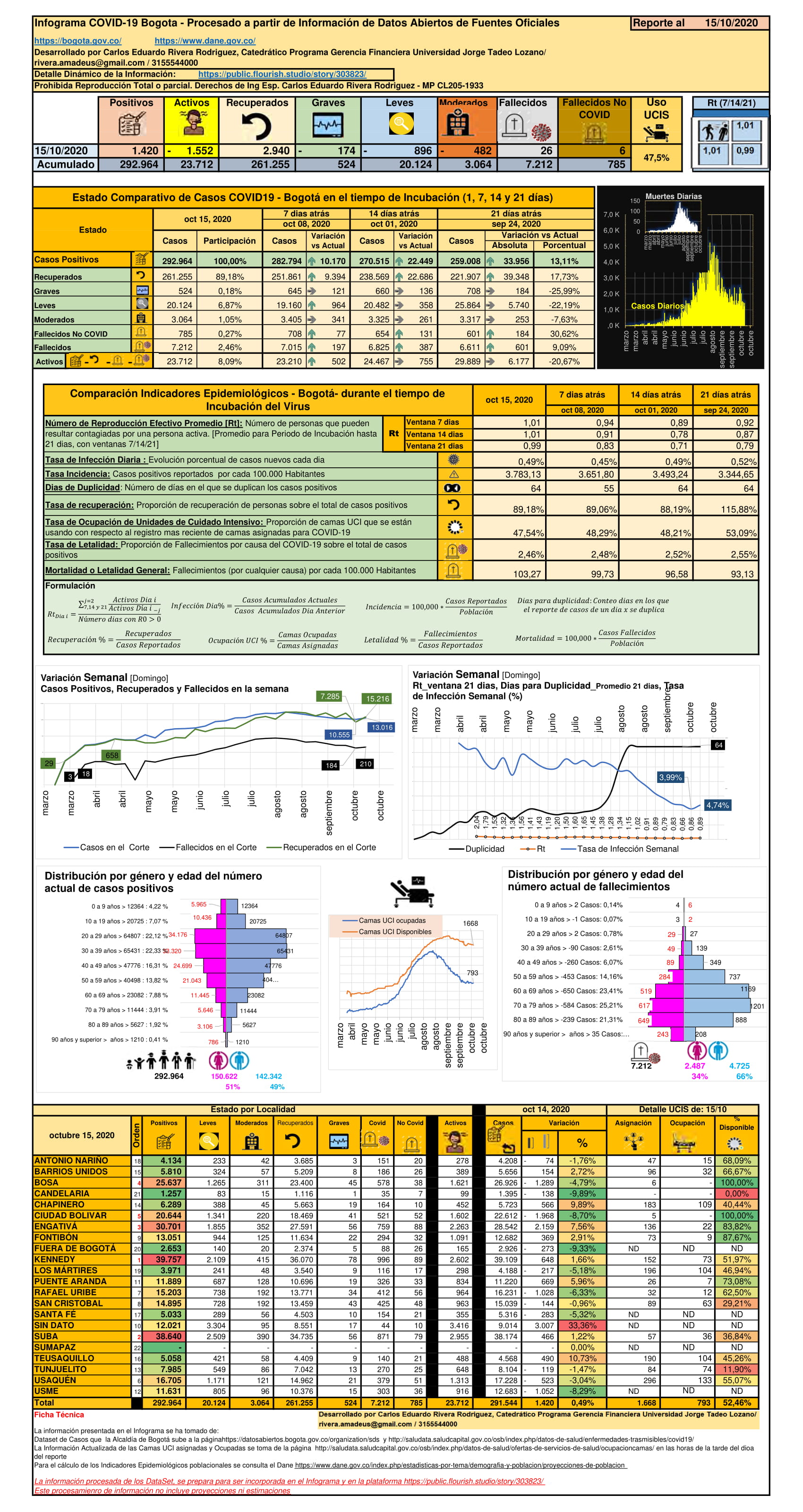 • El Observatorio de Salud de Bogotá reporta, para el 15 de octubre, 964 casos [10.170 en la semana], 7.212 fallecimientos [197 en la semana], 261.255 pacientes recuperados [9.394 en la semana] y 23.712 casos activos.