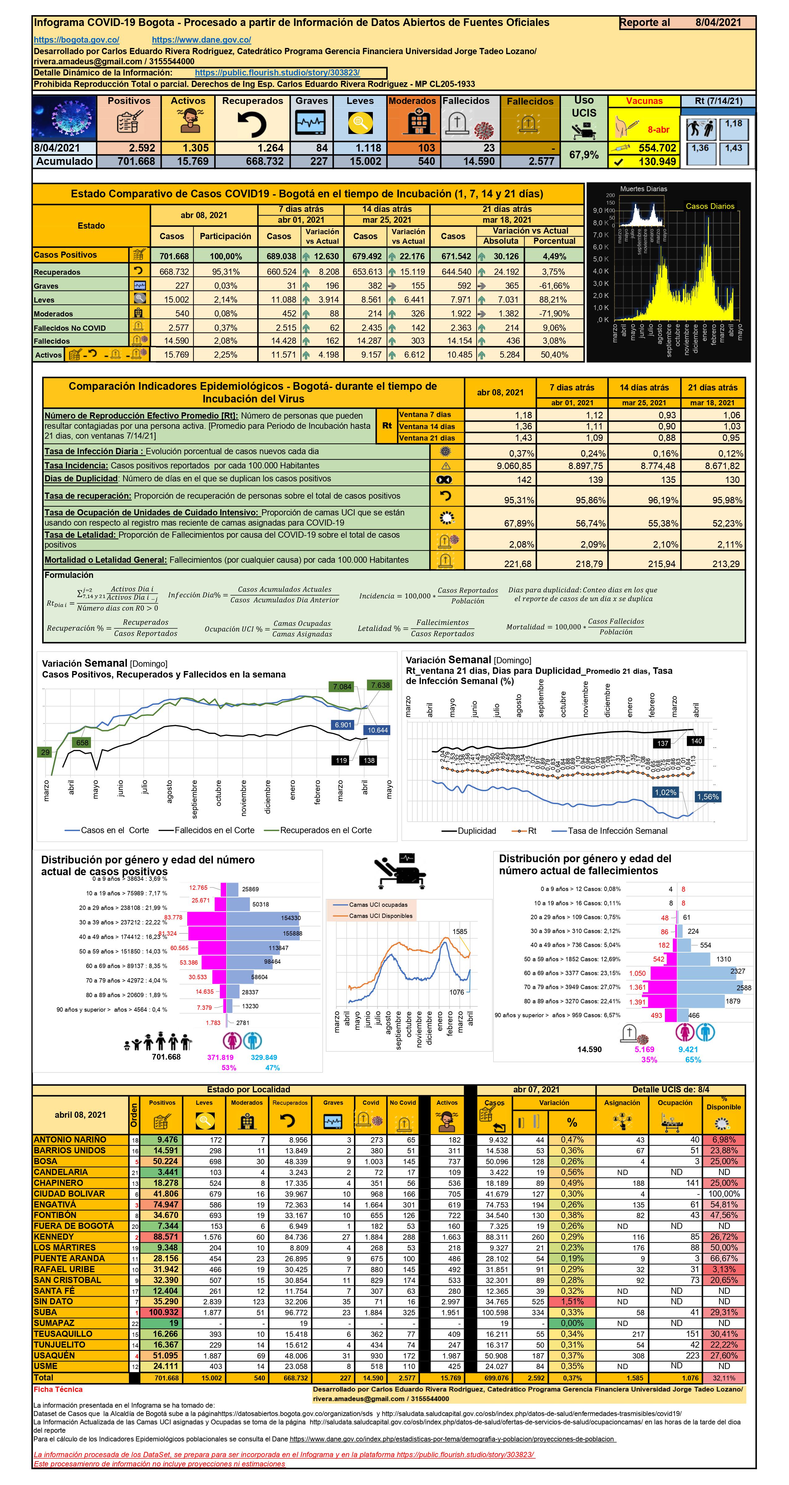 Nuestra capital llegó el 8 de abril a 701.668 casos positivos, comparados con el acumulado, al 25 de marzo, de 679.492 (22.176 en dos semanas), lo que implicó 2.592 en el día; es de anotar que la duplicidad de casos se presenta cada 142 días. El saldo acumulado de fallecimientos a la fecha de corte de este artículo fue de 14.590 en comparación con las 14.287 personas a 25 de marzo, donde, para la fecha de corte, se presentaron 23 eventos. Las Unidades de Cuidado Intensivo presentan un alza sostenida durante el ciclo epidemiológico del Covid: 52,23% frente a 55,38% y 56.74%; actualmente se encuentran en 67,89%. La disponibilidad instalada de camas actual es de 1.585.