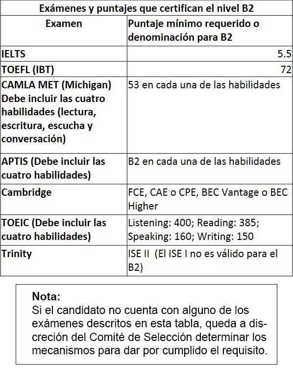 1. Certificación de dominio del idioma inglés. Los candidatos deberán tener como mínimo nivel de inglés B2 (Marco Común Europeo de Referencia para los Idiomas MCER) o equivalente (consulte la tabla de puntajes que certifican el nivel B2). En caso de no contar con la certificación correspondiente, queda a discreción del Comité de Selección determinar el cumplimiento del requisito.