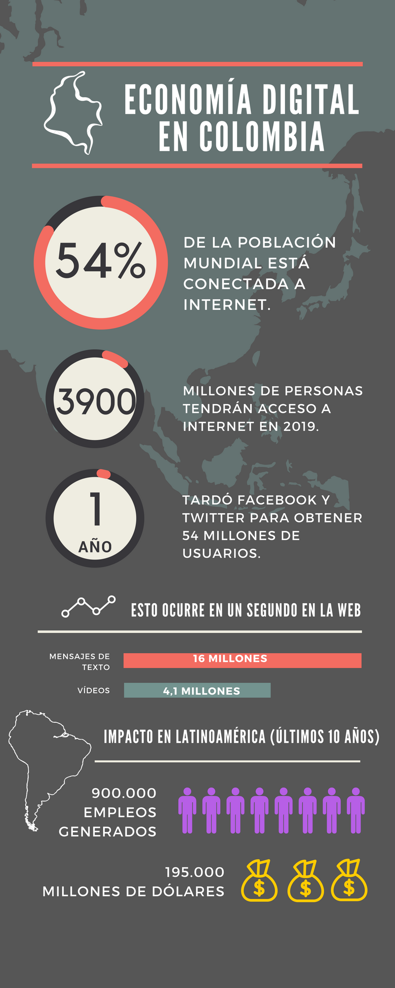 Colombia no ha sido ajena a estas transformaciones que traen consigo las TIC. Sin embargo, aseguró Pimiento, la economía digital se mueve rápido en nuestro país pero con bajo desarrollo. Es por ello que, el Gobierno Nacional creó el Viceministerio de Economía Digital, cuya meta es lograr que hacia el 2025 Colombia sea la primera economía digital en Latinoamérica.