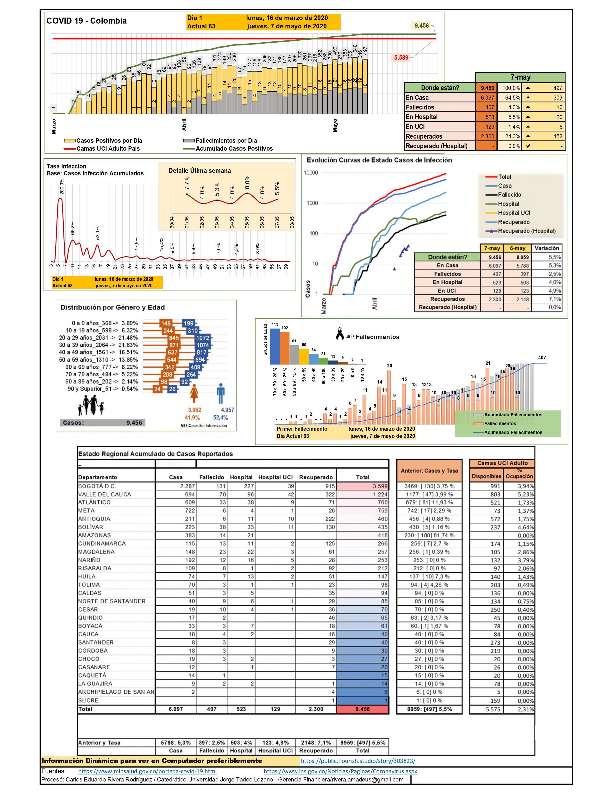 - El primer caso en Colombia se presenta el día 6 de marzo. Dos meses después, con corte al 7 de mayo, se reportan 9.456 casos de infección, de los cuales se han recuperado 2.300 personas (24.3%); 652 casos han requerido hospitalización (6.9%); 129 han necesitado cuidado intensivo (1.4%), y el número de fallecimientos es de 407 personas (4.3%).