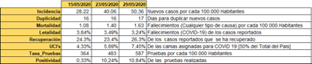 Los fallecimientos de pacientes COVID [Tasa de mortalidad] han venido disminuyendo semana a semana; a 15 de mayo fue del 3,84%, mientras que a 22 de mayo fue de 3.56%, y a 28 de mayo, del 3,24%.