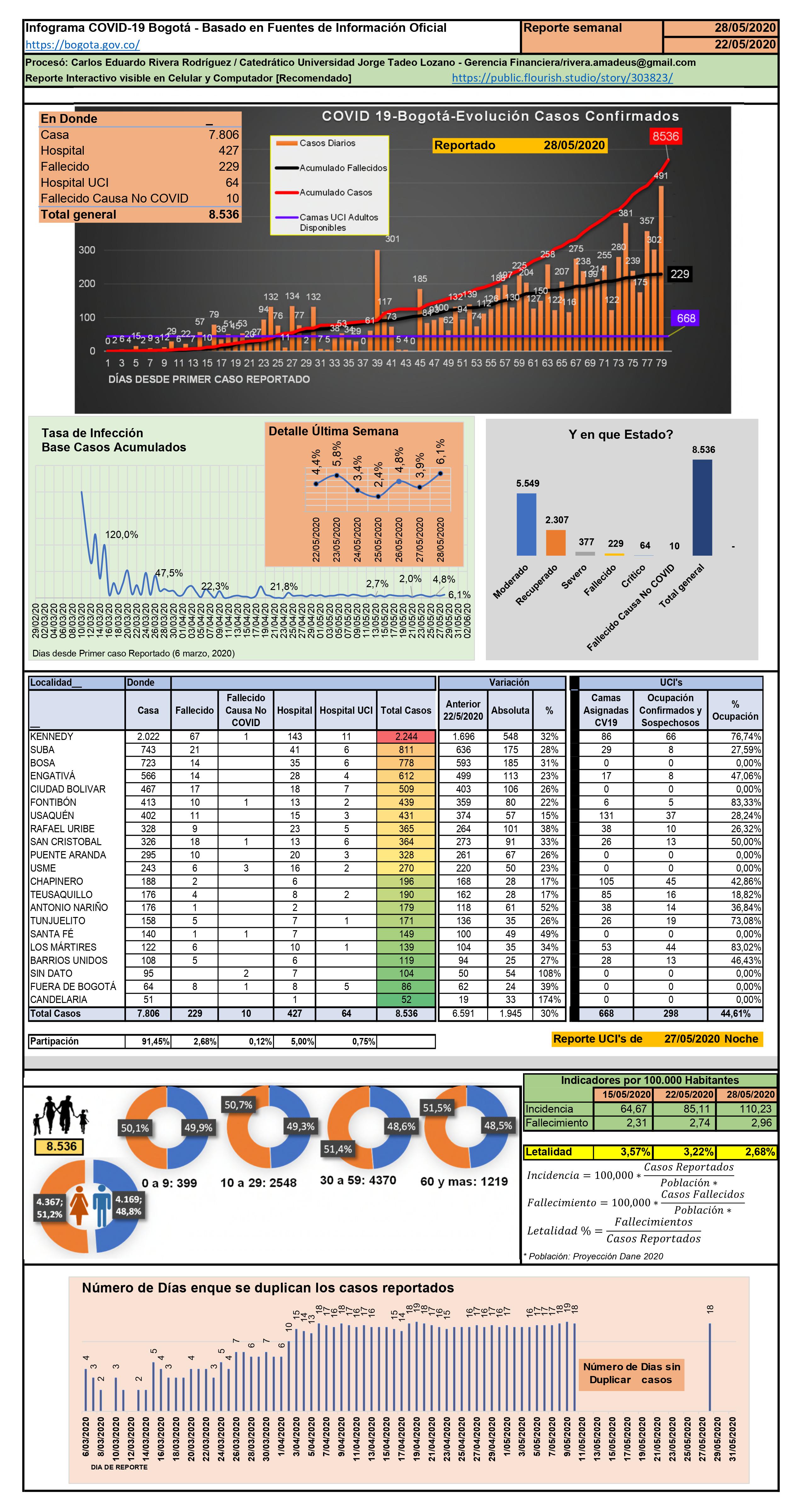 A corte del 28 de mayo, la Alcaldía de Bogotá, en su sitio web, reporta un acumulado de 8.536 casos, los cuales, con respecto al 22 de mayo, equivalen a 1.945 casos nuevos y a un incremento semanal del 30%. De esta cifra acumulada de casos, el 91% de las personas [7.806] controlan la enfermedad en casa; 491 personas fueron hospitalizadas [17%], y de estas, 64 se encuentran en Unidades de Cuidados Intensivos.